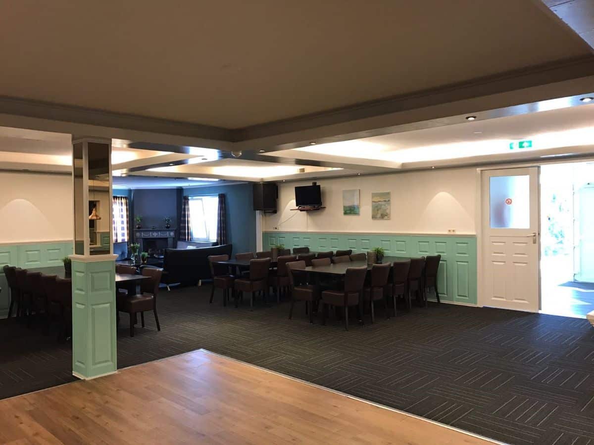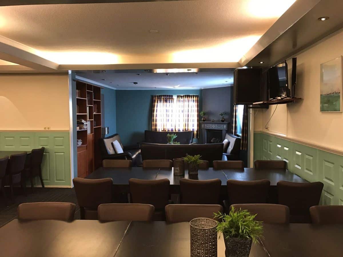 De groepsruimte van dit huis is lekker ruim. Uiteraard staan er genoeg tafels en stoelen voor het hele gezelschap. Ook is er een zithoek met een aantal banken aanwezig. Er is een gezellige bar én er is een biljart aanwezig. Ook is er een dansvloertje in het midden van de groepsruimte. Van achter de bar loop je zo in de professionele keuken, waar zelf gekookt kan worden, of waar je een cateraar lekkere maaltijden kunt laten klaarzetten.