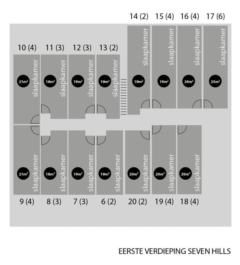 De slaapkamers 2 t/m 5 delen een douche/toilet/wastafel op de gang