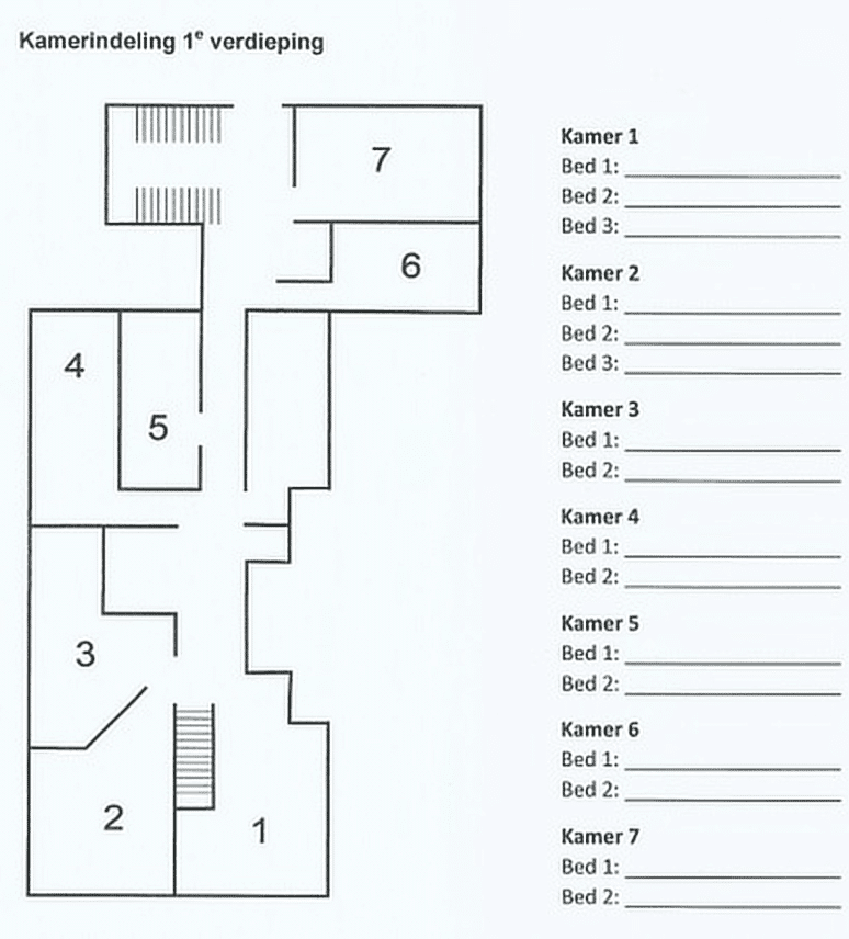 Totaal 21 slaapkamers voor 60 personen.